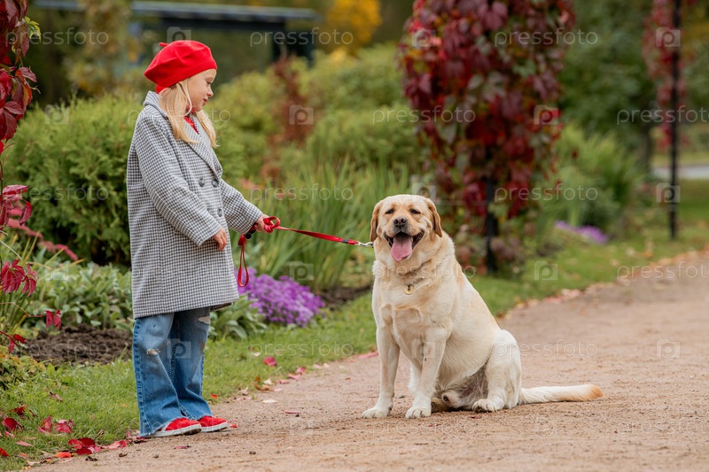 Маленькая девочка в красном берете и пальто гуляет с лабрадором на поводке по тропинке осеннего парка