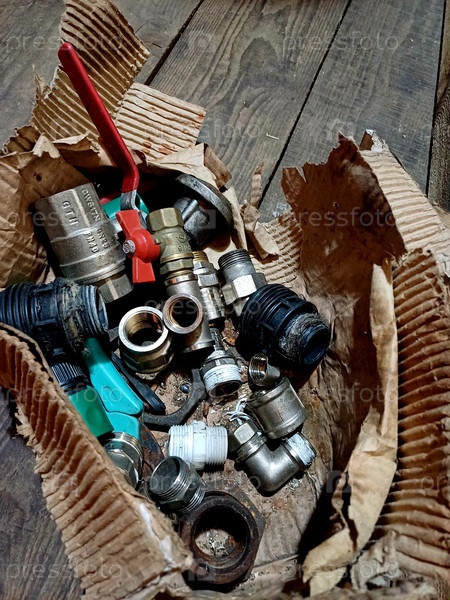 Многие различные сантехнические устройства и аксессуары расположены на деревянной поверхности в мастерской