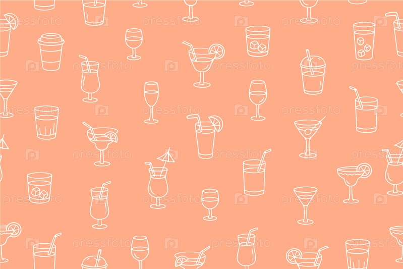 Бесшовный рисунок коктейльных стаканов различной формы и назначения в стиле doodle на оранжевом фоне