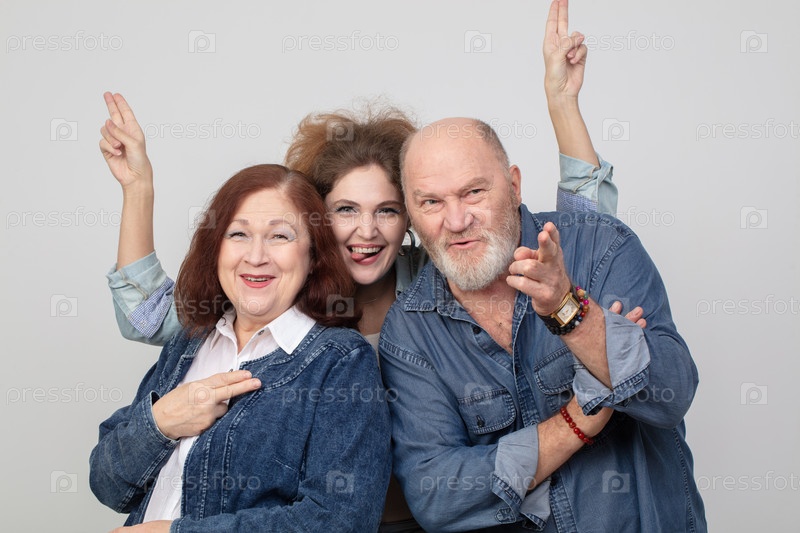 Родители и взрослая дочь. красивая пожилая пара и молодая девушка обнимаются, веселятся и делают мимику перед камерой