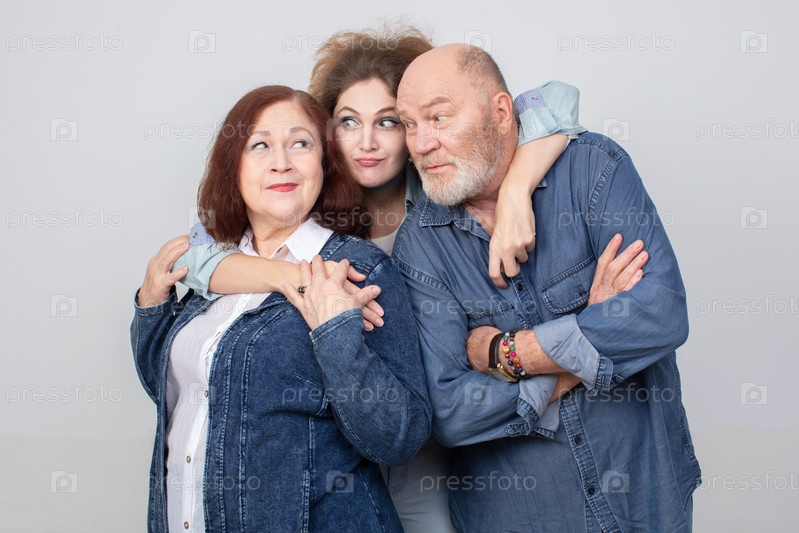 Красивая пара пожилых людей и молодая девушка обнимаются, глядя в камеру
