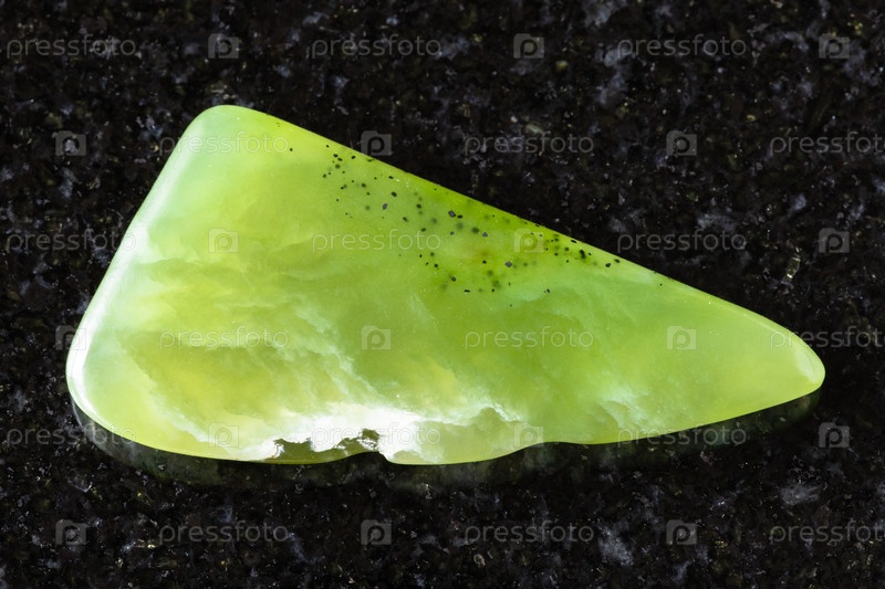 Образец полированного везувианитового минерала на черном гранитном фоне возле Якутии, Россия