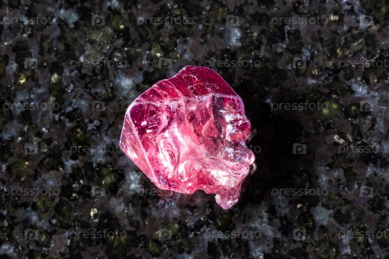 Образец сырого красного спинельного кристалла на черном граните