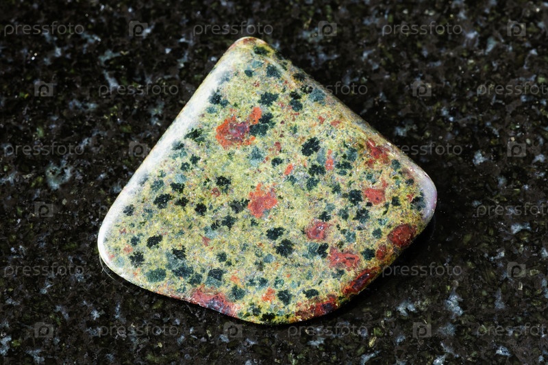 Образец полированного эпидозитного породы на черном граните