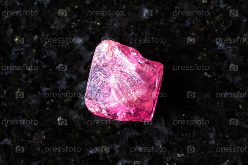 Образец сырого розового кристалла спинеля на черном граните