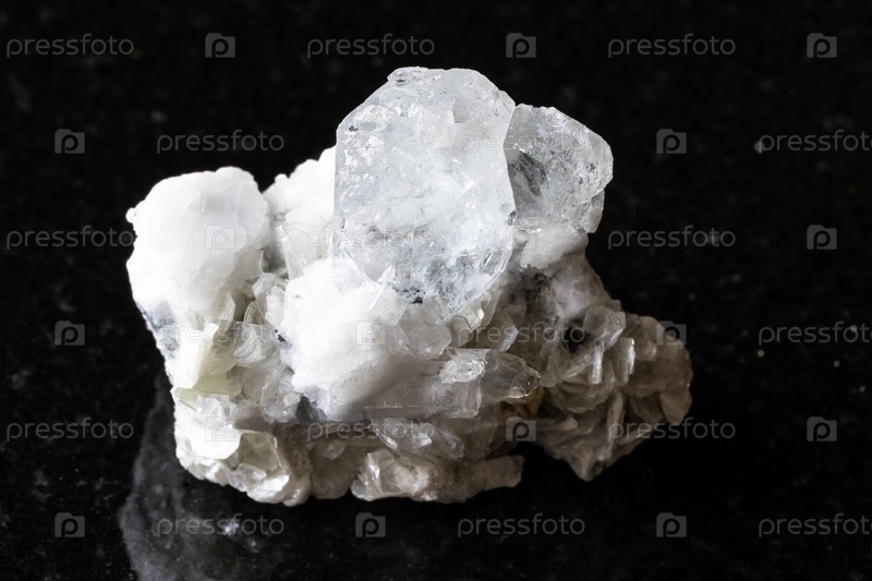 Бесцветный берилль с микой, фельдспарт на черном