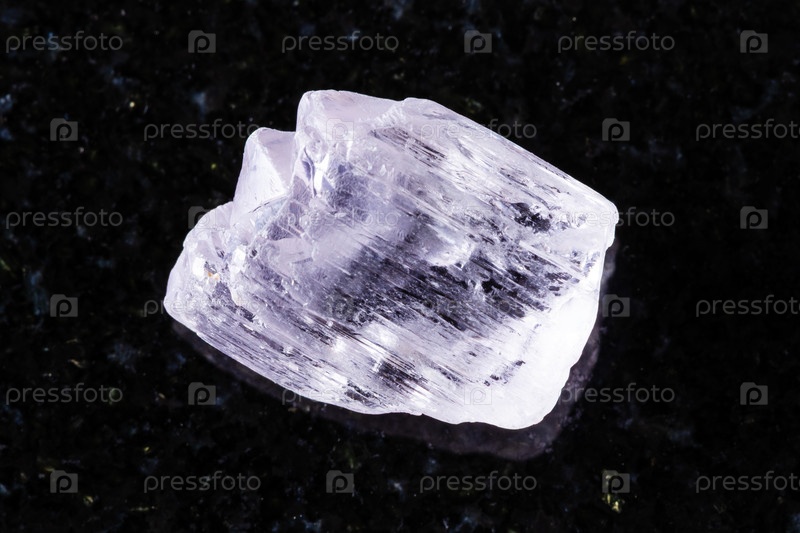 Образец сырого минерального кунзита на черном граните