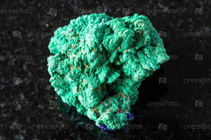 Образец сырой кристаллической малахитовой породы на черном