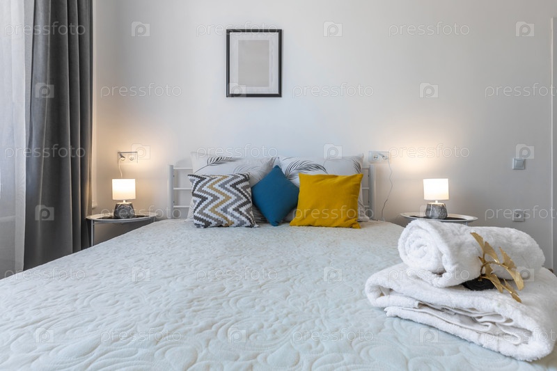Минималистическая уютная спальня с белым одеялом, складываемыми полотенцами, декоративными подушками и двумя ночными лампами в мягком освещении
