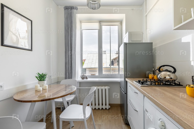 Современная яркая кухня с белой мебелью, газовой плитой, круглым обеденным столом, комнатными растениями, окном и деревянной столешницей