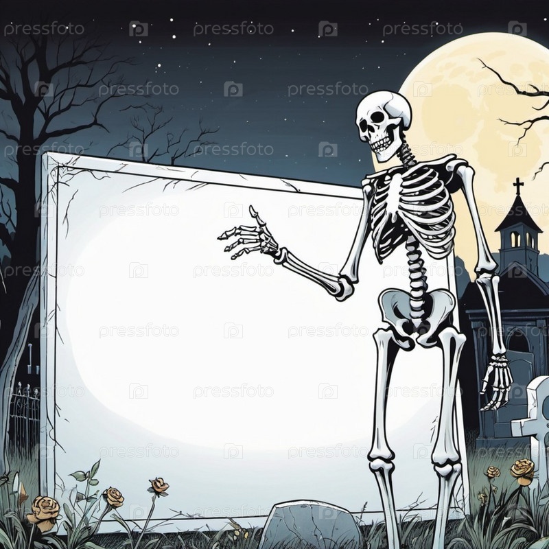 Фигура скелета стоит, держа белый плакат. Склоняющиеся руки скелета дают достаточно места для любого сообщения или дизайна