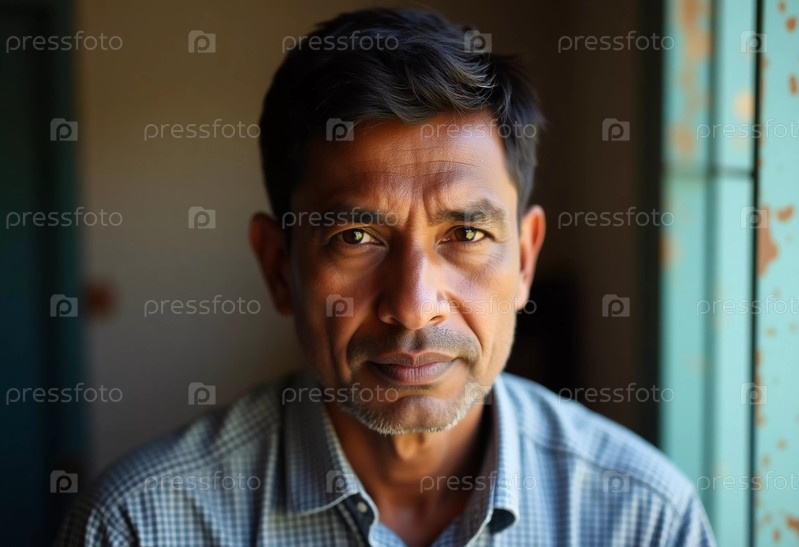 Мужчина средних лет из Индии смотрит вдумчиво, воплощая стойкость и глубину.Мягкий солнечный свет фильтруется через окно, красиво освещая его выражение и окружающую среду
