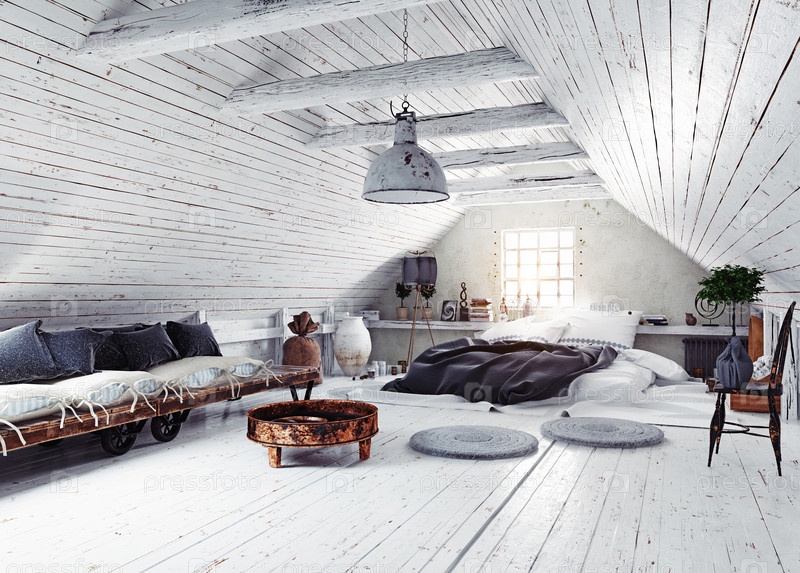 Просторный белый чердак с подушками для сидения на деревянном полу. 3D-рендеринг