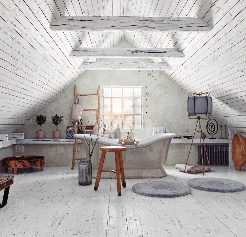 Уютный уголок отдыха с подушками для пола на скандинавском чердаке. 3D-рендеринг