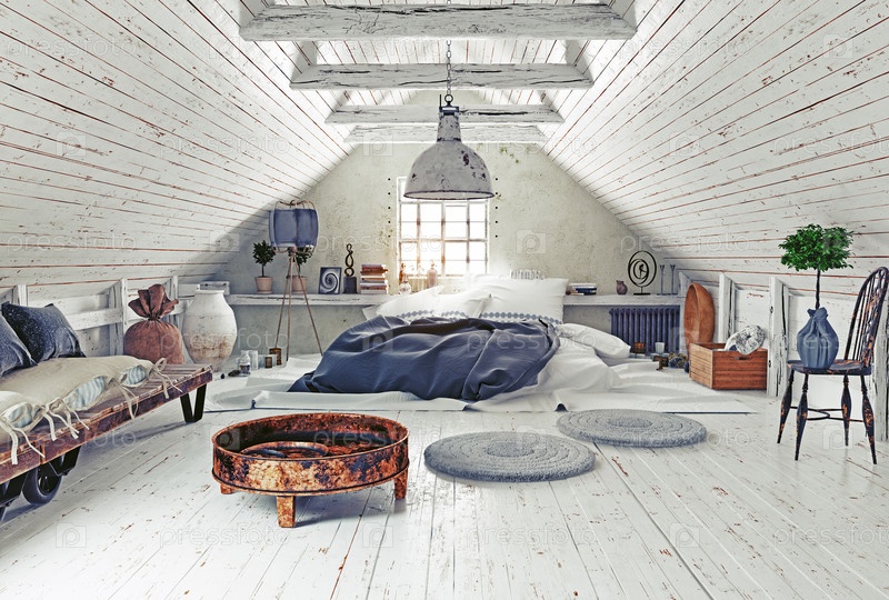 Яркая чердакная комната с мебелью
