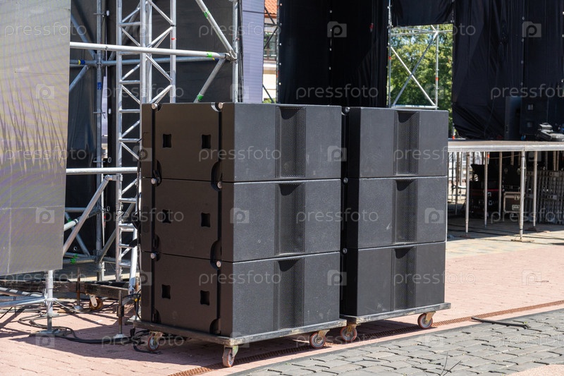 Профессиональные концертные акустические системы, установленные на открытой сцене для живых музыкальных выступлений, готовы к высокоэнергетическому шоу под небом