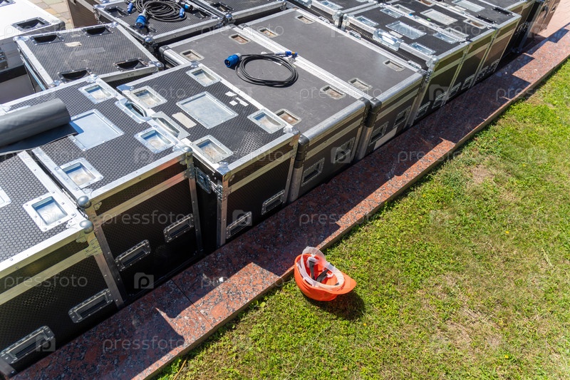Коробки с звуковым и осветительным оборудованием и кабелями рядом со сценой концерта во время установки