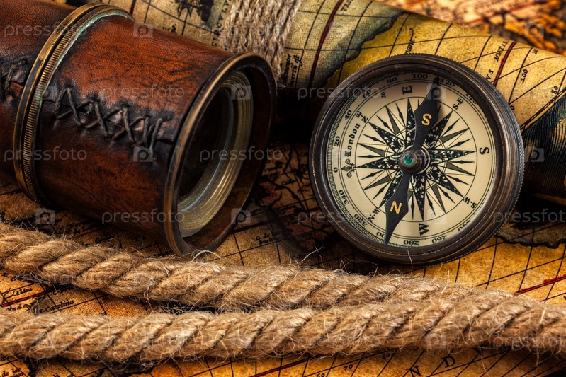 Концепция навигации по географии путешествий - старый винтажный ретро-компас, шпионское стекло и веревка на карте древнего мира