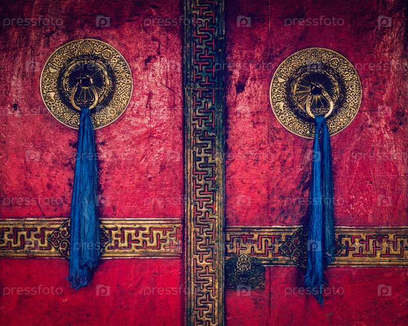 Винтажный ретро-эффект отфильтровал изображение в стиле хипстера ворот Spituk Gompa (тибетский буддийский монастырь) с украшенными дверными ручками