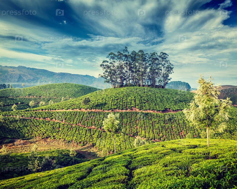 Зеленые чайные плантации в Муннаре, штат Керала, Индия