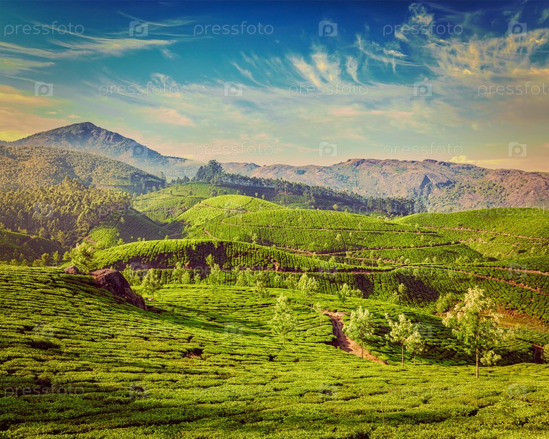 Зеленые чайные плантации в Муннаре, штат Керала, Индия