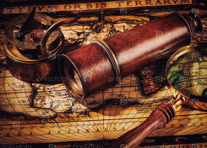 Концепция навигации по географии путешествий - винтажный ретро-эффект фильтруемого изображения старого старинного ретро компаса с солнечными часами, шпионским стеклом и лупой на карте древнего мира