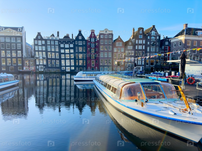 Фасады старых исторических домов с лодками над водой канала, Амстердам, Нидерланды