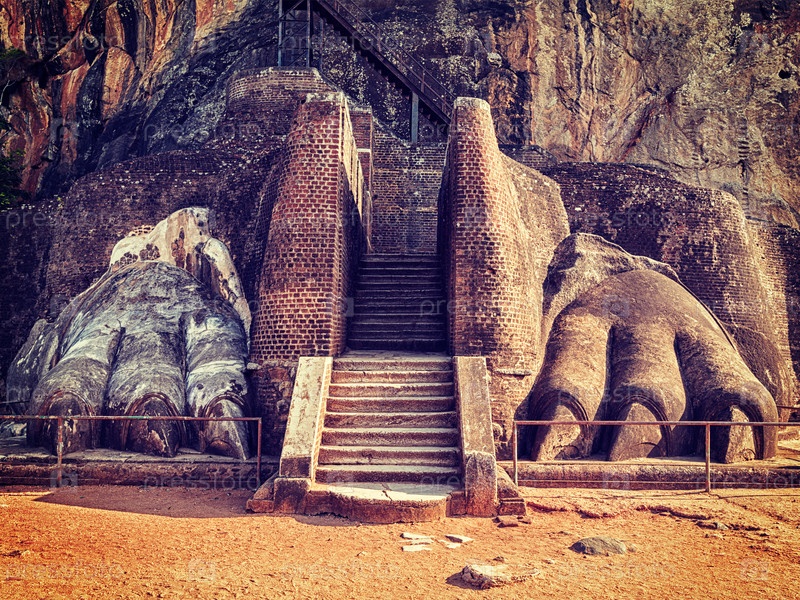 Винтажный ретро-эффект отфильтровал изображение хипстерского стиля знаменитой туристической достопримечательности Шри-Ланки - лапы льва на скале Сигирия, Шри-Ланка