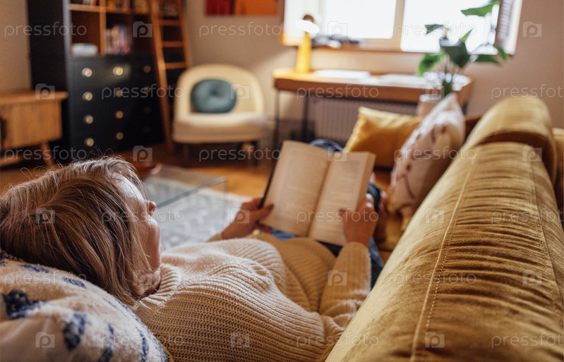Пожилая женщина в повседневной одежде лежит на диване, читая роман