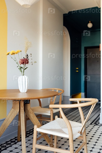 Стильная обеденная комната с круглым деревянным столом и удобными стульями из натуральных материалов