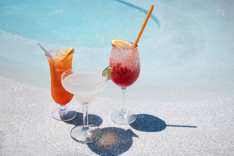Вкусные коктейли из ягод в элегантных бокалах на стороне бассейна. чашки прохладных летних напитков с нарезами апельсина и лайма на фоне голубой воды