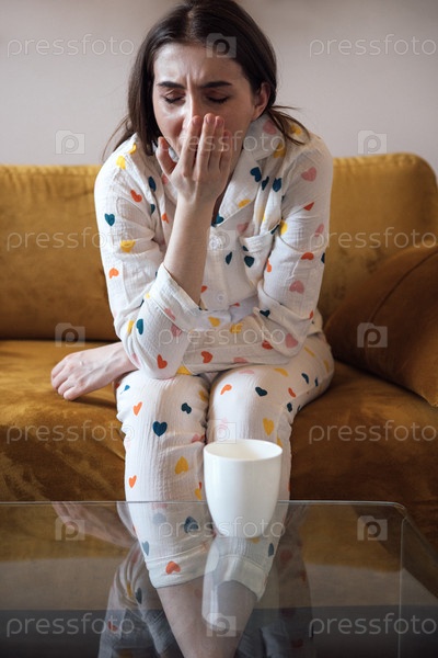 Идея смешной девушки в милых печатных пижамах, сидящей на диване и зевающей. подросток засыпает сидя на диване. бессонная девочка с чашечкой кофе дома
