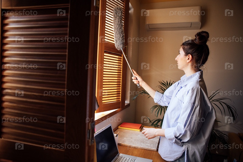 Молодая женщина в синей рубашке светит из-за деревянных жалюзи с трубопроводом