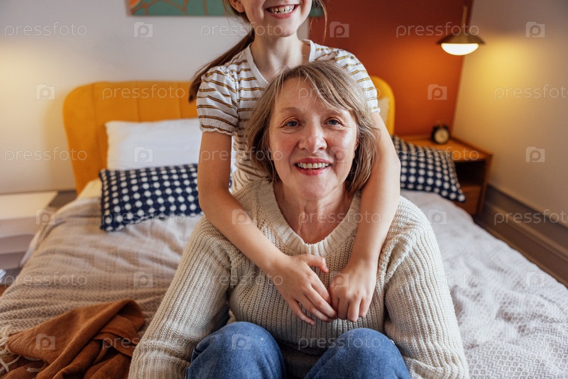 Пожилая женщина и ее прекрасная внучка обнимаются и сидят на кровати.Маленькая девочка с бабушкой улыбается и расслабляется в спальне.Зрелая женщина и ребенок веселятся вместе
