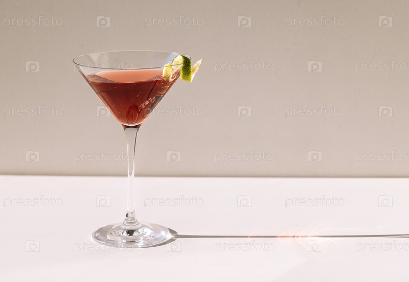 Закрытый стакан мартини на белом столе. элегантная чашка с красным спиртным газированным напитком, украшенным изюмом лимонов. вкусный коктейль из ягод