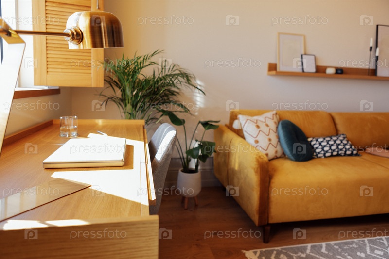 Близкое домашнее рабочее пространство с деревянным столом, стильной золотой лампой и ноутбуком. яркий солнечный свет в спальне. Стильная гостиная со желтым диваном