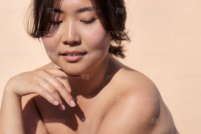 Азиатская женщина с закрытыми глазами, нежно опирающая свой подбородок на свою руку, демонстрируя естественную красоту и спокойное выражение на мягком пастельном фоне, олицетворяя спокойствие и покой