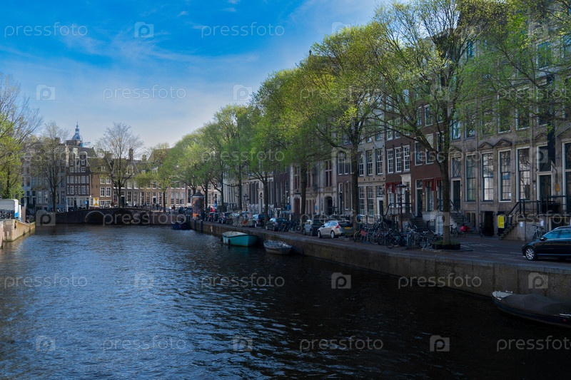 Фасады старых исторических домов и деревьев над водой канала, Амстердам, Нидерланды