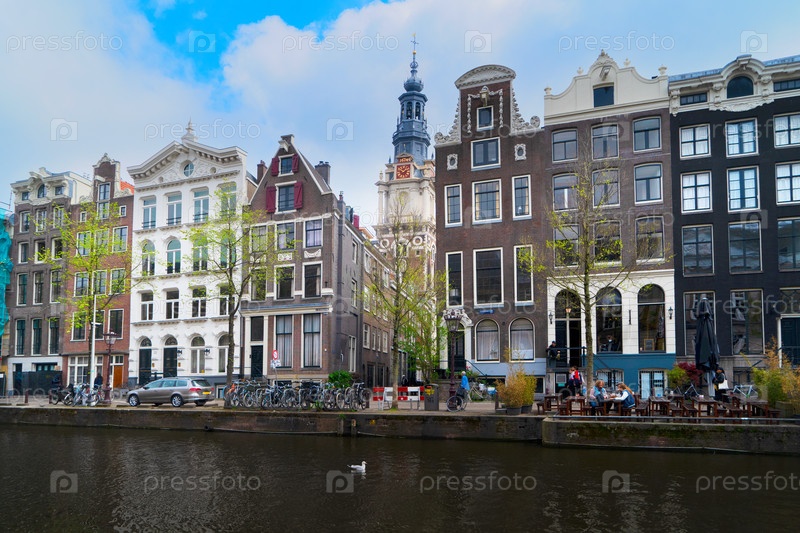 Фасады старых исторических домов и деревьев над водой канала, Амстердам, Нидерланды
