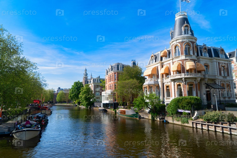 Фасады старых исторических домов и деревьев над водой канала, Амстердам, Нидерланды