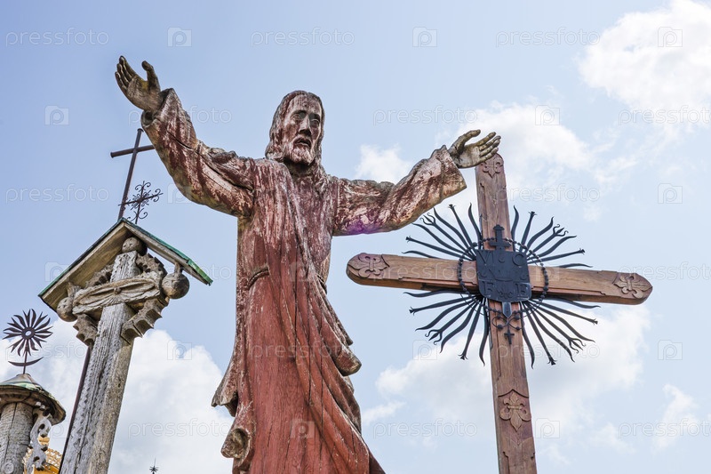 Деревянная статуя Иисуса с распростертыми руками на Литовском холме крестов