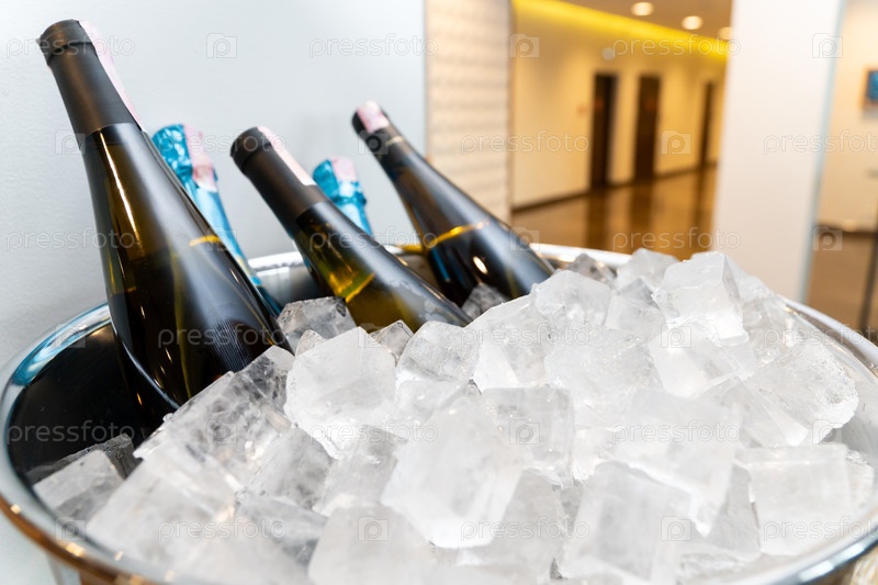 Элегантный банкет с бутылками вина и шампанского, охлаждающимися в большой таре льда на выставке в лобби роскошного отеля для гостей