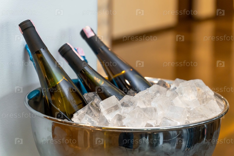 Элегантный банкет с бутылками вина и шампанского, охлаждающимися в большой таре льда на выставке в лобби роскошного отеля для гостей