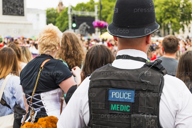 Медик британской полиции стоит на параде, готовый оказать первую помощь и экстренную медицинскую помощь. безопасность мероприятия, общественная безопасность, городская толпа, униформы и детали оборудования