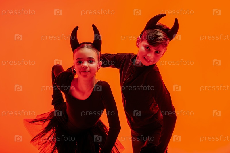 Детские фигуристки, одетые как дьяволы, выступают на льду в Хэллоуин