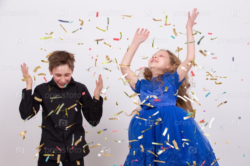Маленький красивый мальчик и его милая сестренка в шляпах смеются и бросают красочные конфетти на белом фоне