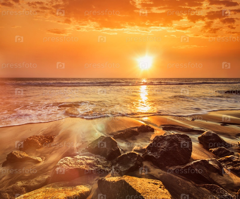 Волны и скалы на пляже заката