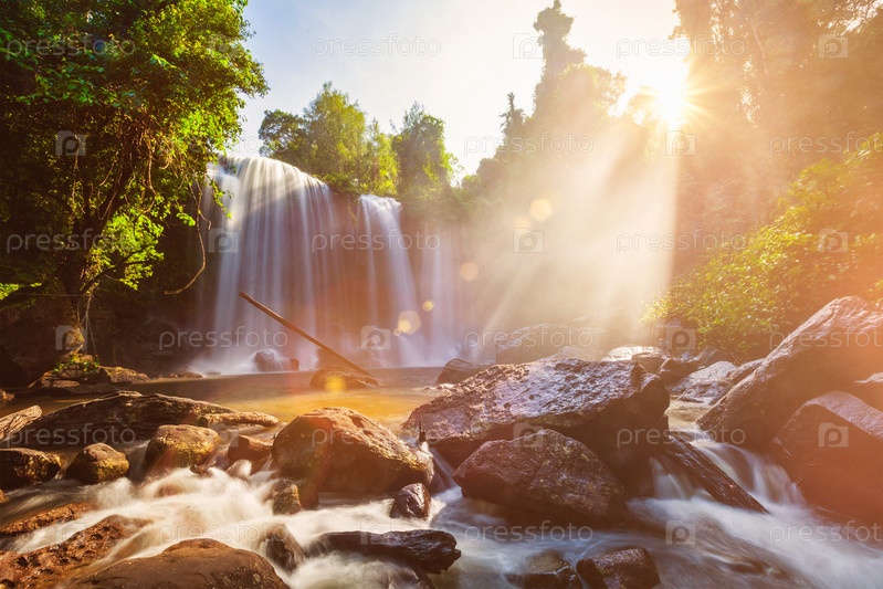 Тропический водопад утром при солнечном свете в Камбодже