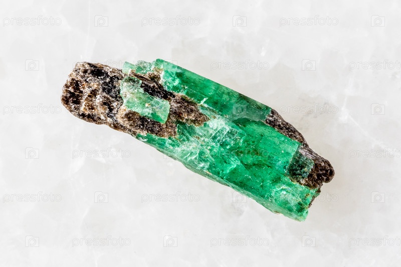 Образец сырого изумрудового кристалла на белом мраморе
