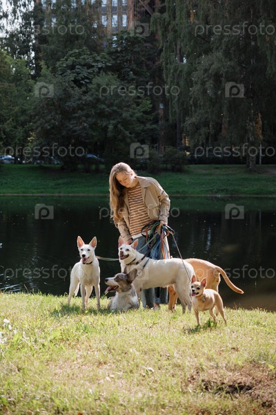 Медсестра гуляет с собаками в парке у озера. концепция дружбы, питомца, отдыха